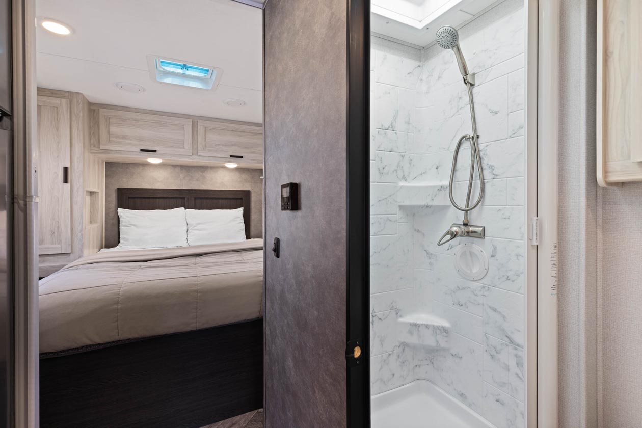 Our Maxi motorhome gives Guests totally flexibility with their RV vacation plans. When the day is done, rest your head, or just relax. Take the worry and stress out of planning a trip when you rent a maxi motorhome. The thoughtfully designed interior of our Class C Maxi Motorhome features a separate rear bedroom with a queen bed and has all the comforts you can expect in a home away from home.