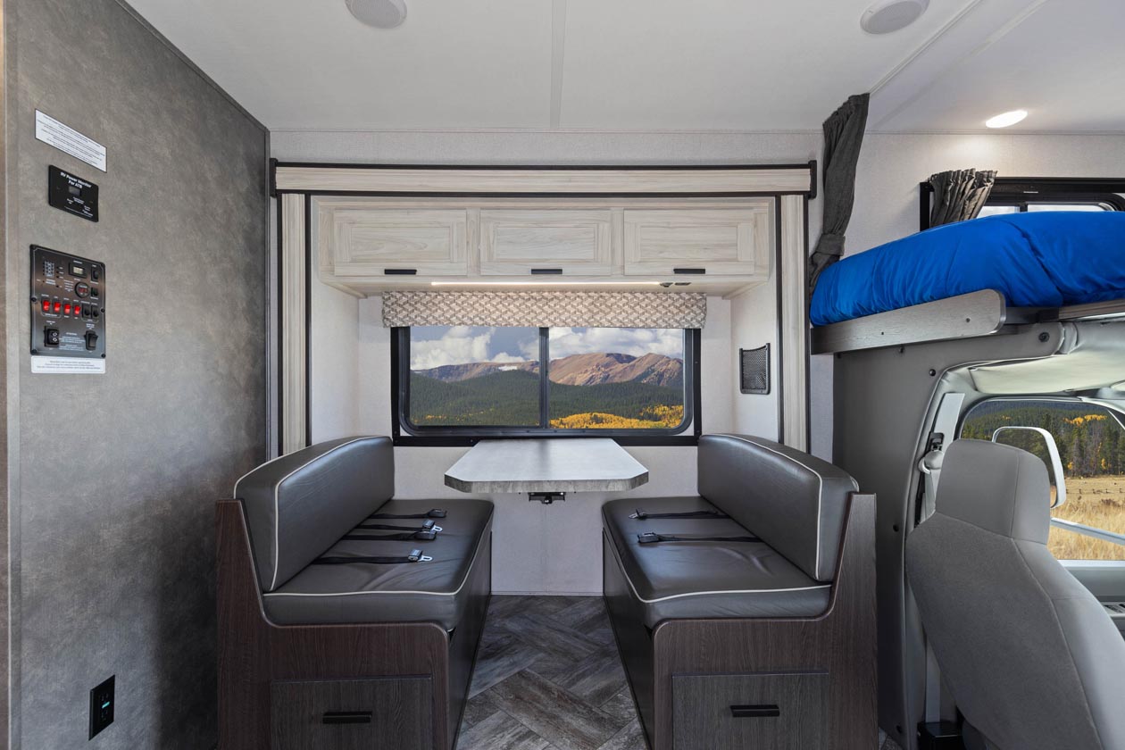 The dinette comfortably seats four people and quickly converts into a bed suitable for one small adult or two small children. Image is representative only of the interior of our MHA. Actual RV received at pick-up may have a slightly different configuration.