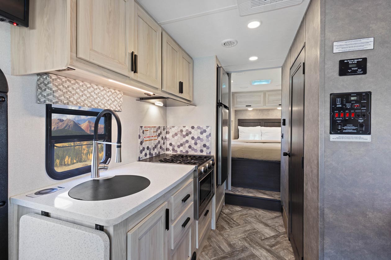The fully functional kitchen has everything you need to cook meals on the go. Image is representative only of the interior of our MHA. Actual RV received at pick-up may have a slightly different configuration.