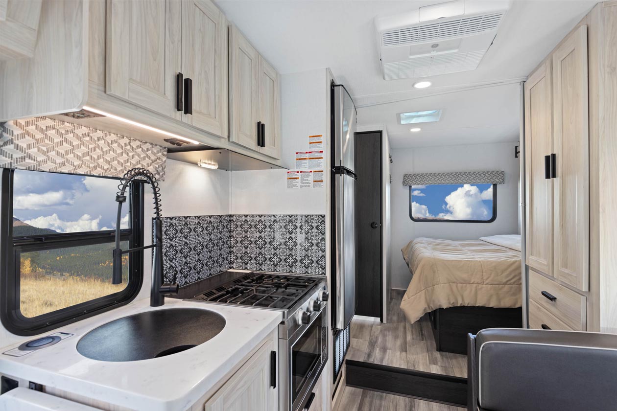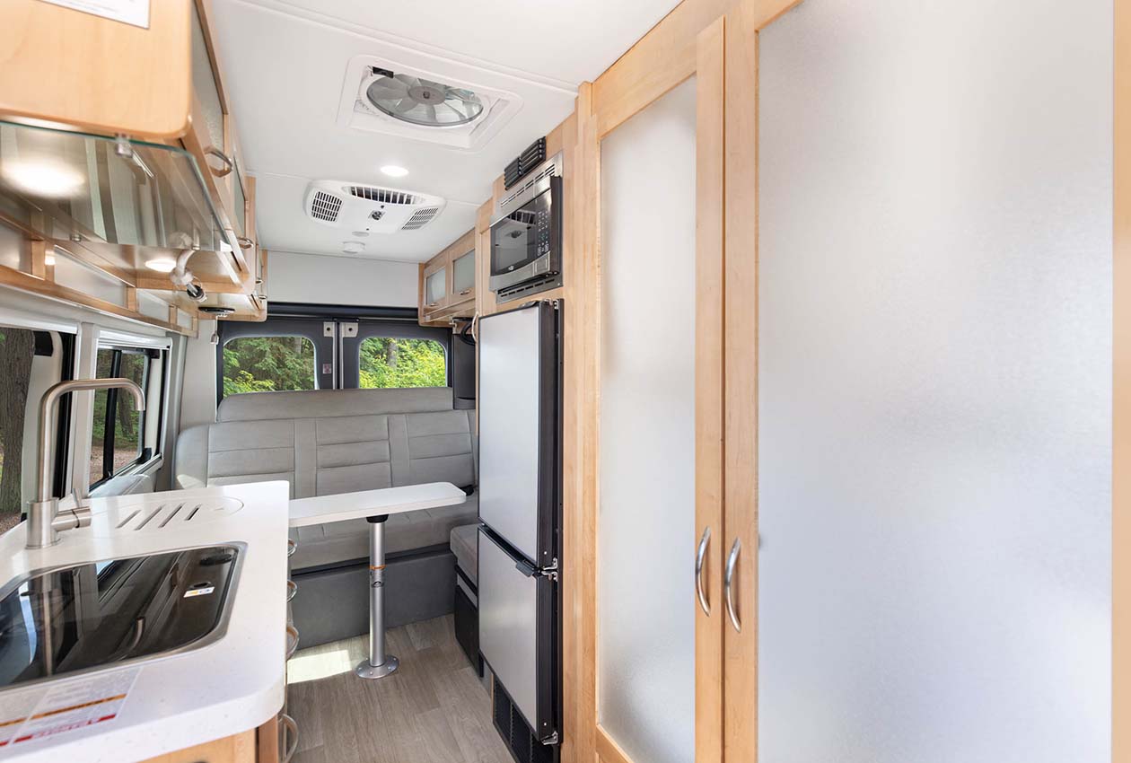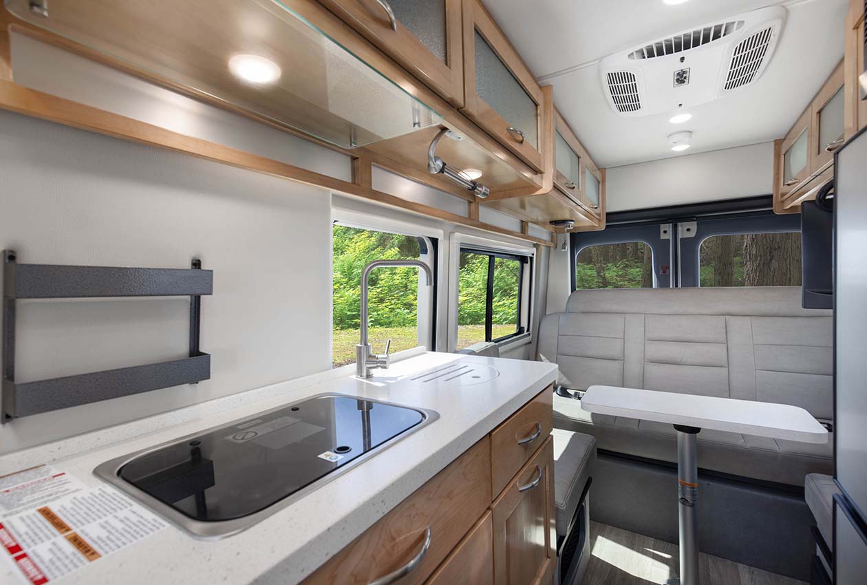 The Super Van Camper is design efficiency at its best. The kitchen has everything you need to cook a nutritious meal for the family on the road. Image is representative only of the interior of our SVC. Actual RV received at pick-up may have a slightly different configuration.