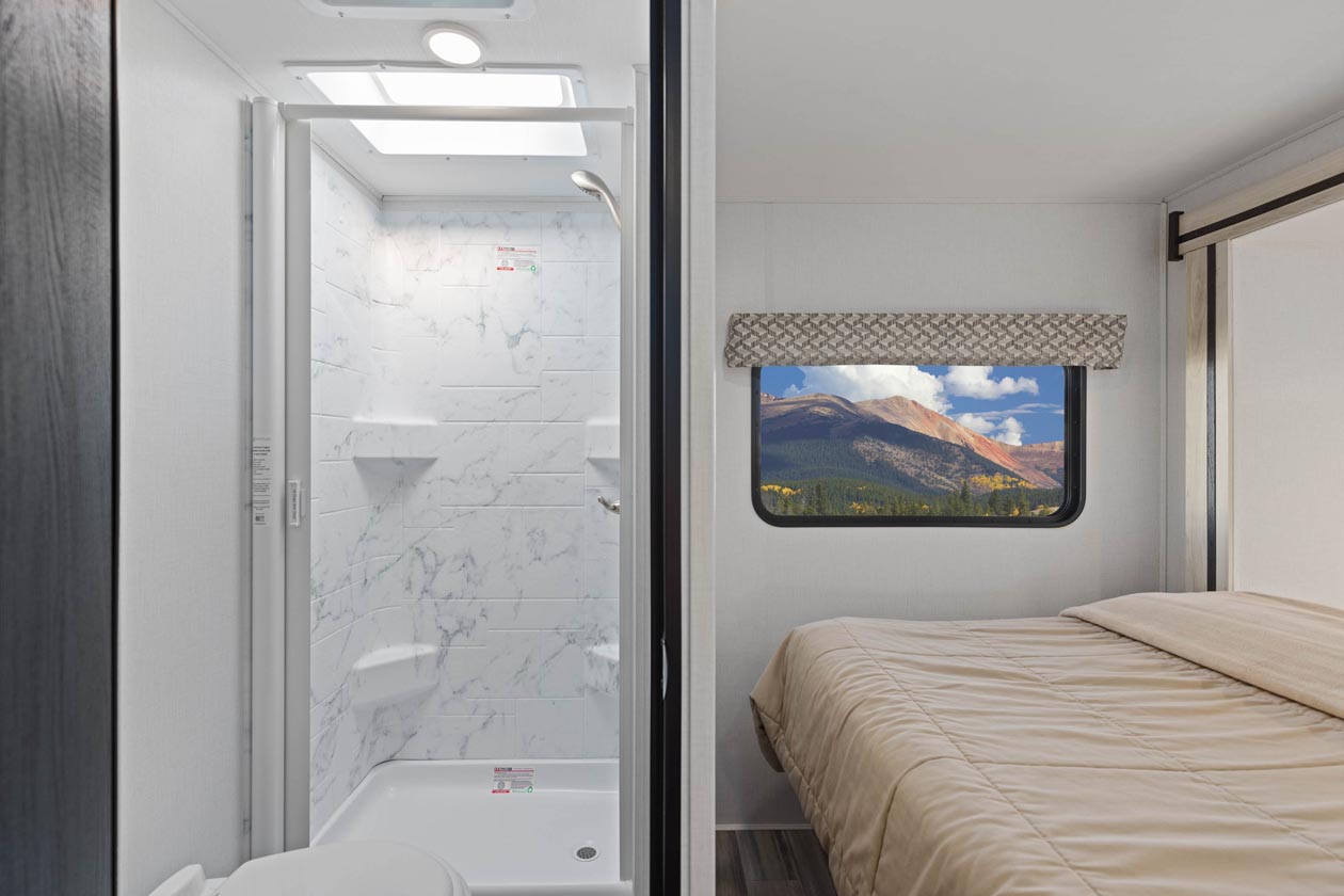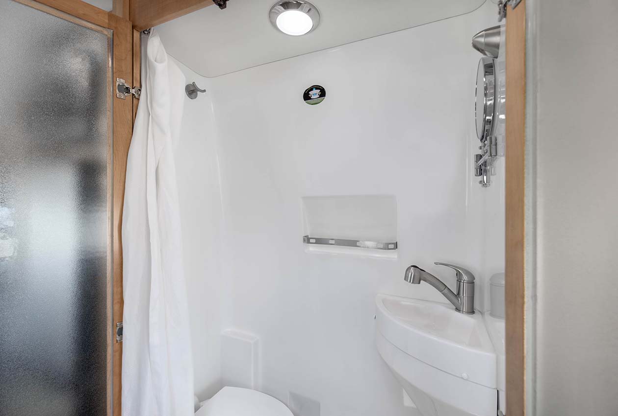 The compact bathroom contains a toilet and stand-up shower and is located at the rear of the RV. The vanity is just outside the bathroom door.