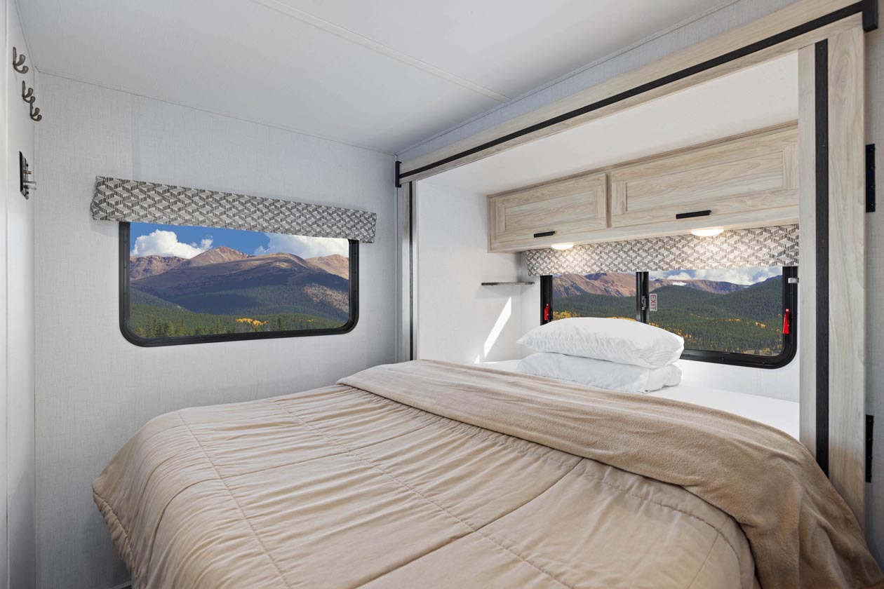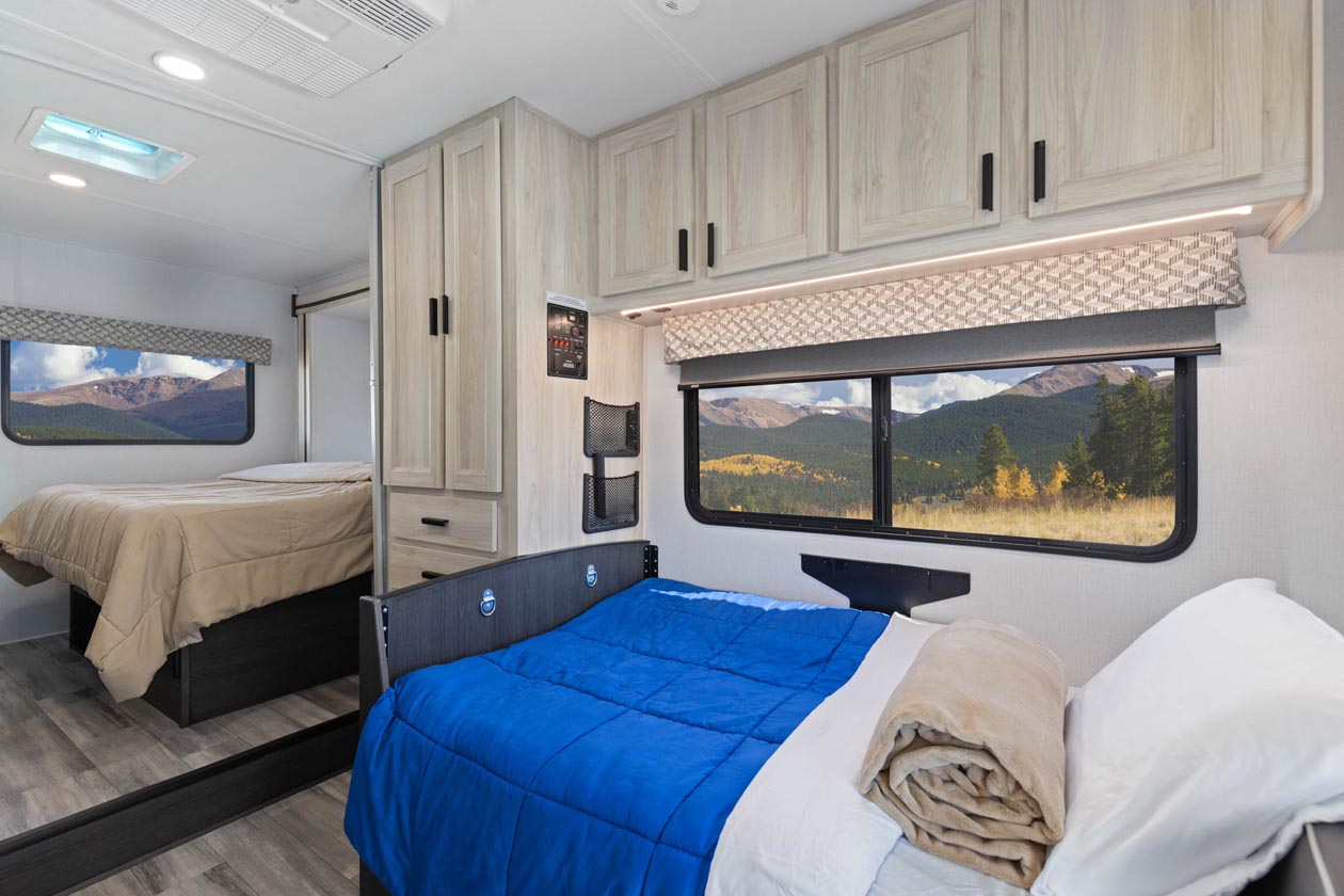 The dinette quickly converts into a bed suitable for one small adult or two small children, while couples can enjoy the privacy of the rear bedroom which can be separated with a folding screen. Image is representative only of the interior of our SVC. Actual RV received at pick-up may have a slightly different configuration.