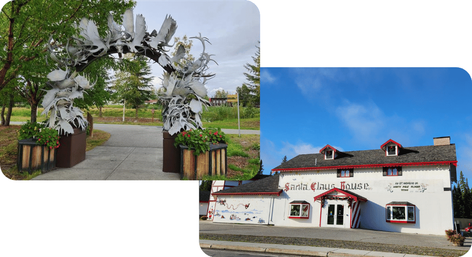 North Pole – quirky year-round Christmas village just east of Fairbanks on the highway east to Tok. Despite its name, it’s about 1700 miles south of geographic North pole and over a hundred miles south of the Arctic Circle, but is a interesting stopping off point along the highway. Here you’ll find candy cane light poles, holiday themed streets and the famous Santa Claus House. Letters from children addressed to the North Pole arrive here each year.