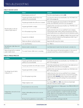 indicator light stays on Propane gas bottle shut-off valve is closed Turn lever to point at selected bottle. See PROPANE GAS