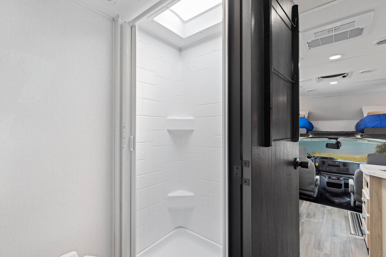The bathroom contains the toilet, a sink and a stand-up shower. Image is representative only of the interior of our MHB. Actual RV received at pick-up may have a slightly different configuration.
