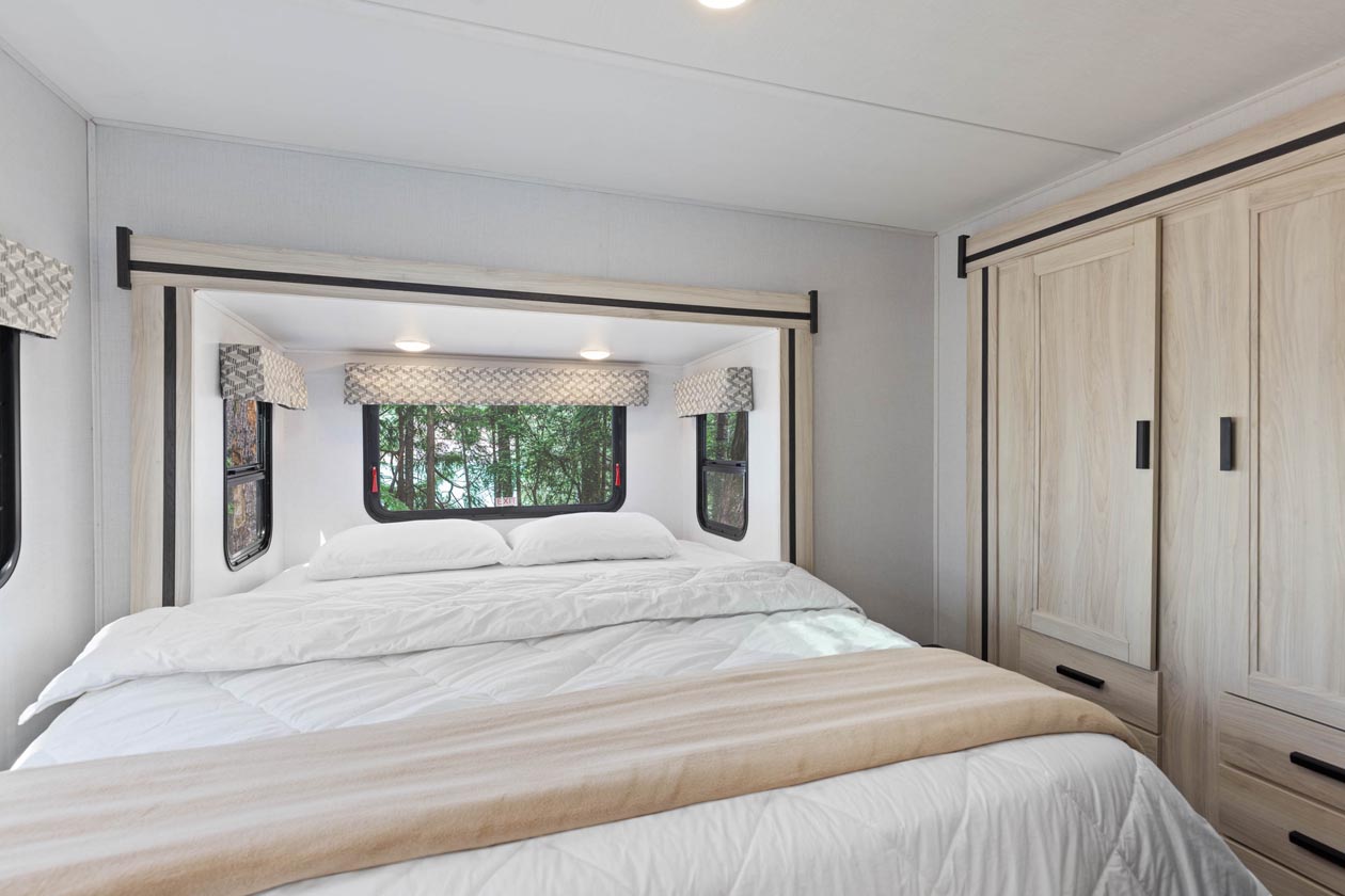 The rear queen bed provides maximum comfort and relaxation. Ample wardrobe space is provided with an additional slideout to the side of the RV. Image is representative only of the interior of our MHB. Actual RV received at pick-up may have a slightly different configuration.