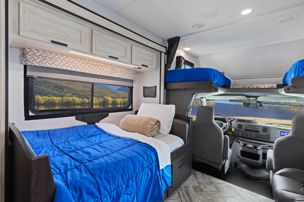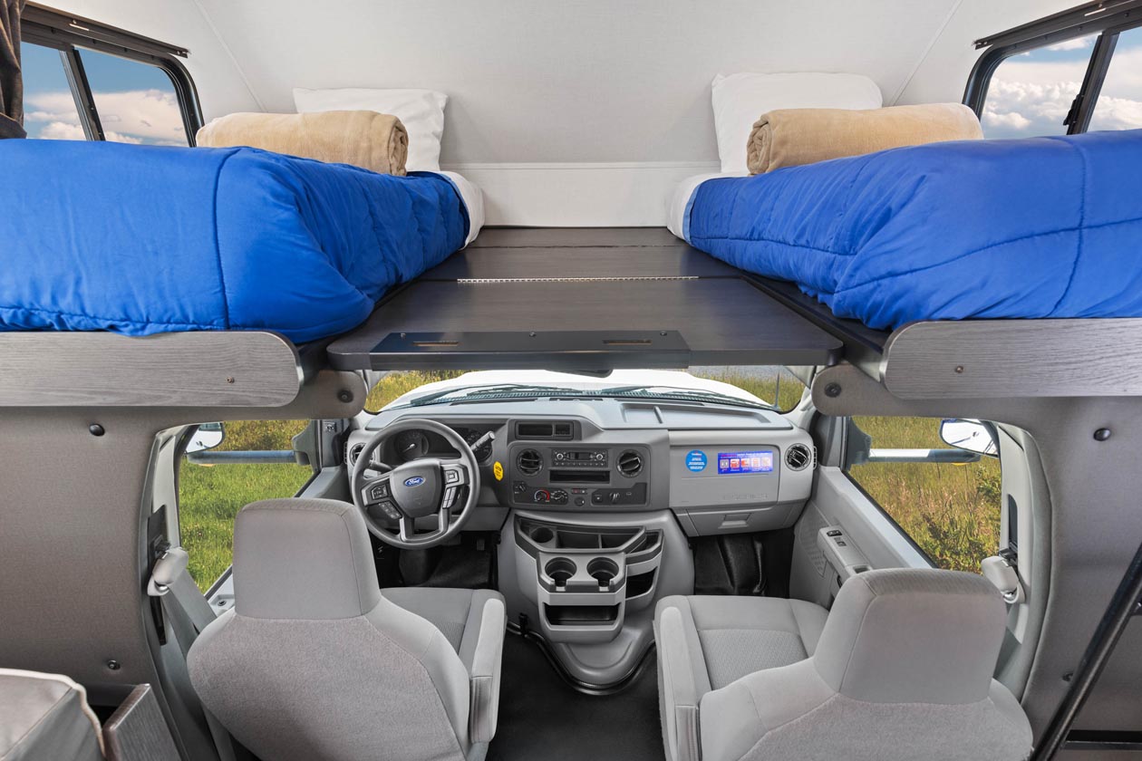 The dinette quickly converts into a bed suitable for one small adult or two small children, and there's room for two people in the overcab beds. Image is representative only of the interior of our MHB. Actual RV received at pick-up may have a slightly different configuration.