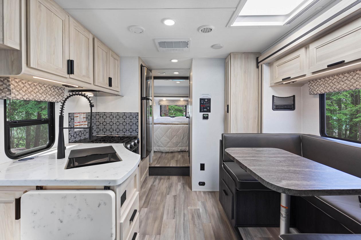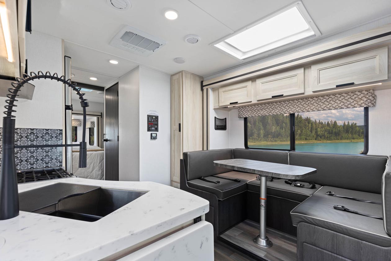 The dinette provides space for eating and sitting and easily converts to a bed suitable for one small adult or two small children. Image is representative only of the interior of our MHB. Actual RV received at pick-up may have a slightly different configuration.