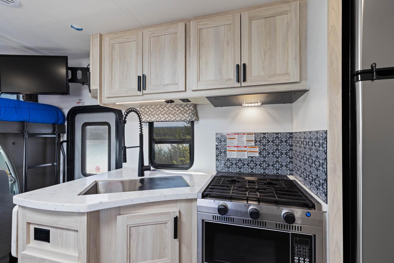 The Midi Motorhome is design efficiency at its best. The kitchen has everything you need to cook a nutritious meal for the family on the road. Image is representative only of the interior of our MHB. Actual RV received at pick-up may have a slightly different configuration.