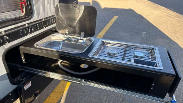 The Summit’s slide-out kitchen includes a dual-burner stove, stainless sink, and on-demand hot water for off-grid cooking.