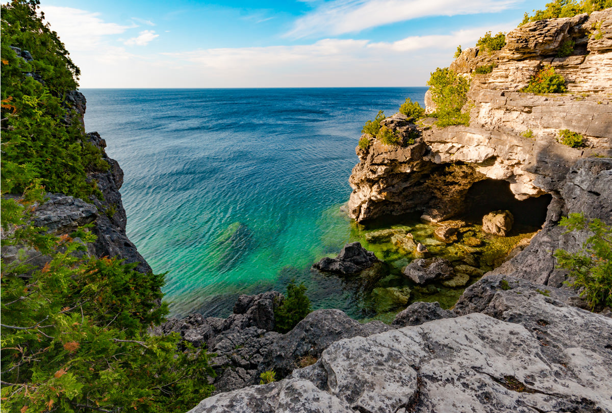 Hike to the Grotto, a natural sea cave carved from ancient limestone filled with azure-blue water of Georgian Bay.